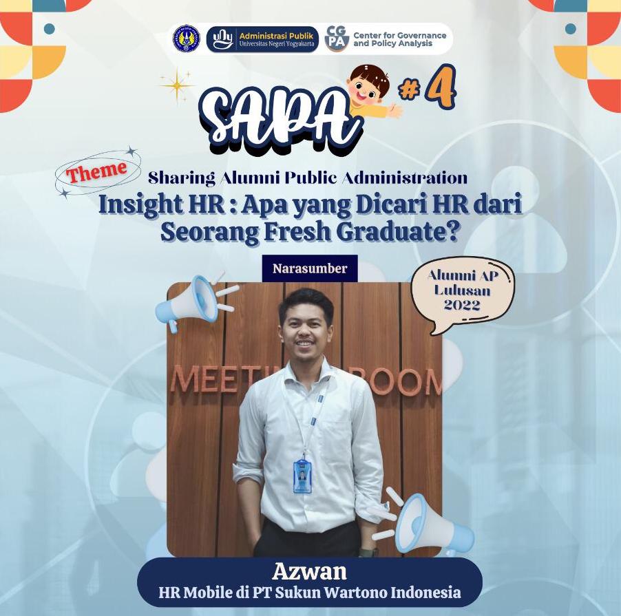 Yogyakarta, 29 Mei 2025 – Departemen Administrasi Publik UNY melalui CGPA (Center for Governance and Policy Analysis) kembali menyelenggarakan kegiatan SAPA (Sharing Alumni Public Administration) #4 secara daring melalui platform Zoom Meeting. Kegiatan kali ini mengusung tema “Insight HR: Apa yang Dicari HR dari Seorang Fresh Graduate” dengan menghadirkan Azwan, HR Mobile dari PT Sukun Wartono Indonesia, sebagai narasumber utama.
