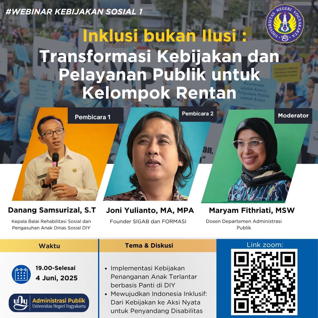 Yogyakarta, 4 Juni 2025 - Departemen Administrasi Publik, Fakultas Ilmu Sosial dan Ilmu Politik, Universitas Negeri Yogyakarta, sukses menyelenggarakan Webinar Kebijakan Sosial dengan tema “Inklusi Bukan Ilusi: Transformasi Kebijakan dan Pelayanan Publik untuk Kelompok Rentan”. Acara ini berlangsung secara daring melalui Zoom Meeting dan Dimulai pada pukul 19.05 WIB dengan mendatangkan sejumlah narasumber. Dua narasumber pertama berasal dari Balai Rehabilitasi Sosial Dan Pengasuhan Anak yakni Bapak Danang Samsurizal, S.T. dan Bapak Feriawan Agung Nugroho, S.Sos., MPA. Sementara itu narasumber ketiga adalah Bapak M. Joni Yulianto, MA, MPA selaku Founder SIGAB dan FORMASI.